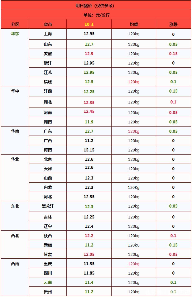 从数据分析,受屠宰场调价,预计,10月1日,外三元标猪报价在12.31元/公斤,后市关注集团猪企出栏以及屠宰场开工率的变化!