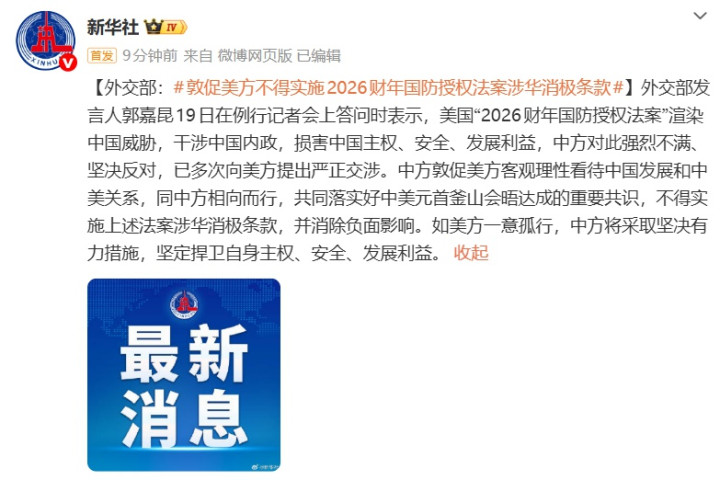 外交部发言人郭嘉昆19日在例行记者会上答问时表示,美国“2026财年国防授权法案”渲染中国威胁,干涉中国内政网络在线股票配资,损害中国主权、安全、发展利益,中方对此强烈不满、坚决反对,已多次向美方提出严正交涉。